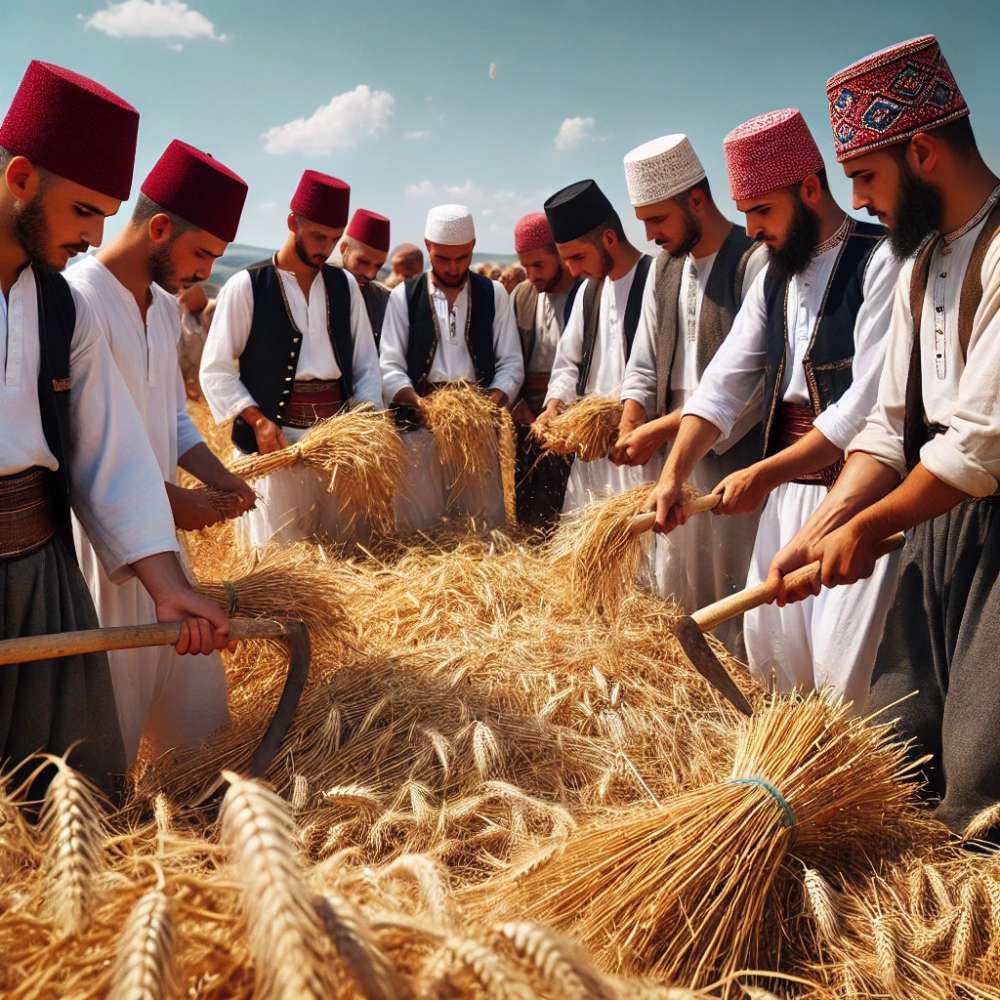 A tamo negdje među žetelicama vidiš crvene fesove kao makove u žitu i među koscima vezene peškire, kako u naborima padaju preko glave i ramena i čuvaju mozak od nesnosne žege. Za fesovima i peškirima pomiču se kupilice, bijele snaše, i djevojke, sa crvenim pregačama, zelenim rupcima na glavi, i onda se čovjeku pričinja ta zemlja kao neka začarana bašta, u kojoj raste živo cvijeće u najzanosnijim bojama, koje hoda, smije se i pjeva.