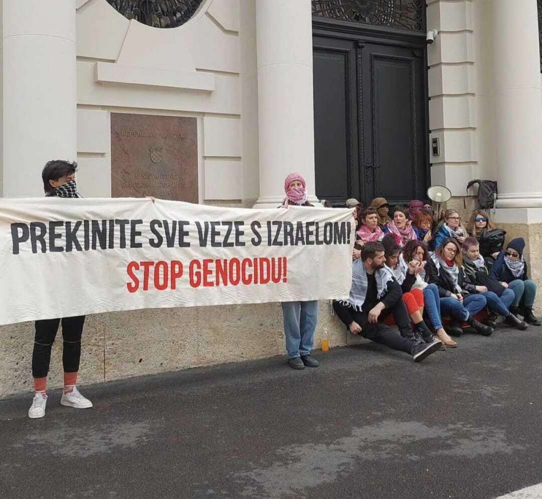 – Deseci ljudi privedeni su danas nakon što su nenasilno blokirali Ministarstvo vanjskih i europskih poslova u Zagrebu, kao čin protesta protiv hrvatskog sudioništva u genocidu u Gazi.