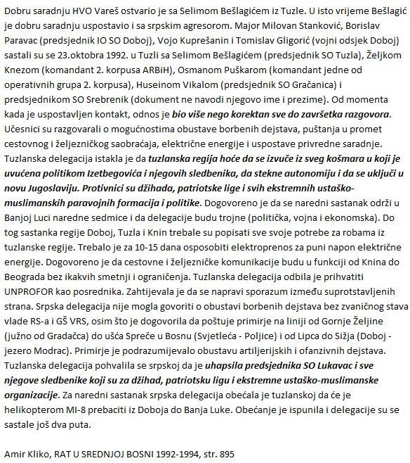 U jednom odlomku, stoji slijedeće: „Tuzlanska delegacija je isticala da tuzlanska regija želi da se izvuče iz košmara u koji ju je uvukla politika Alije Izetbegovića i njegovih sljedbenika, da stekne autonomiju i da se uključi u novu Jugoslaviju.“ Ovaj citat, često izdvajen u javnim raspravama, predstavlja najdirektniji pisani navod u historiografiji koji eksplicitno povezuje Tuzlu s idejom autonomije. Kliko ga smješta u kontekst razgovora i kontakata koji su se odvijali tokom 1992. godine između regionalnih političkih aktera i predstavnika srpskih vojnih i političkih struktura, u vremenu kada su se na terenu tražila različita rješenja za izlazak iz ratnog haosa.