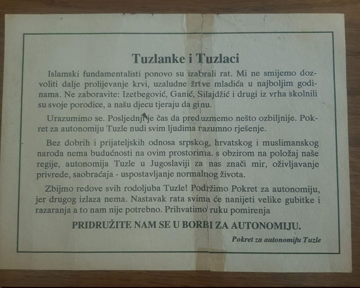 Godine 1993. u Tuzli se pojavljuje letak potpisan kao „Pokret za autonomiju Tuzle“, u kojem se otvoreno zagovara autonomija Tuzle u okviru Jugoslavije i kritikuje državni vrh Bosne i Hercegovine. Ovaj dokument je autentičan i nedvosmisleno pokazuje da je ideja autonomije postojala u javnom prostoru.
