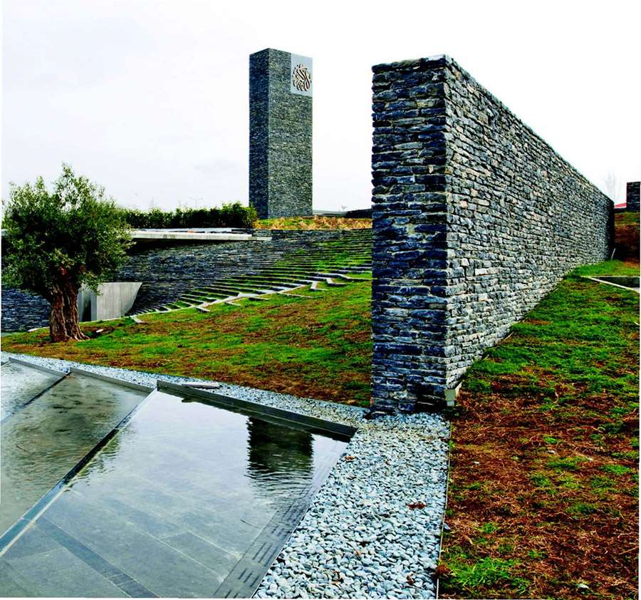 Zbog konfiguracije terena, objekat je gotovo u potpunosti integrisan u zemlju. Posjetilac se stepenasto spušta niz padinu, ostavljajući iza sebe svakodnevnu užurbanost, da bi se postepeno našao u prostoru koji odiše mirom. Visoki zidovi avlije jasno razdvajaju vanjski, dinamični svijet od unutrašnje, smirene atmosfere.