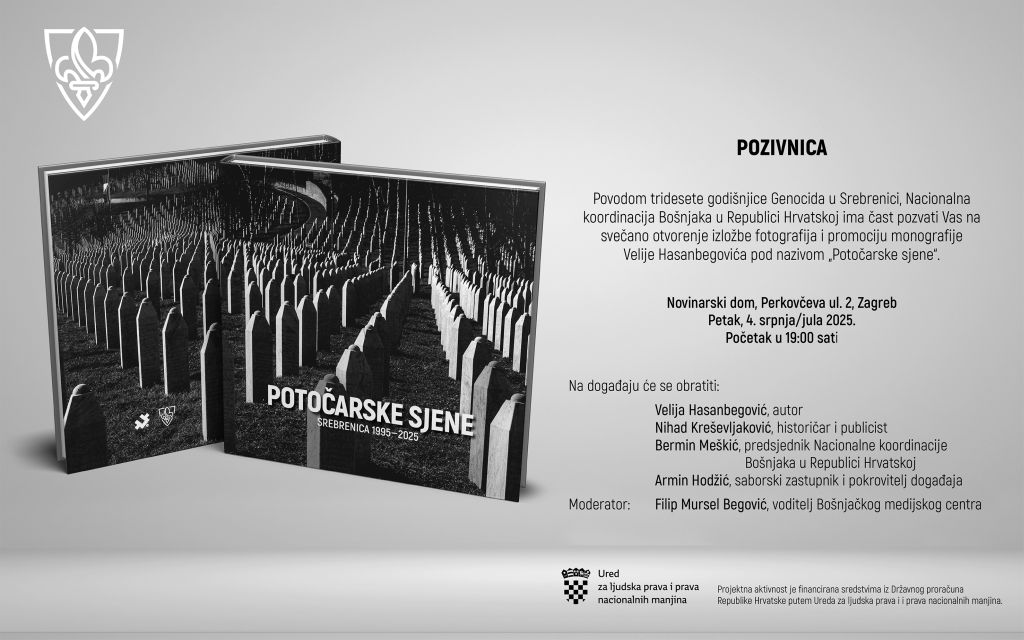Povodom tridesete godišnjice Genocida u Srebrenici, Nacionalna koordinacija Bošnjaka u Republici Hrvatskoj ima čast pozvati građane, javnost i sve ljude savjesti na svečano otvorenje izložbe i promociju monografije „Potočarske sjene“ fotografa Velije Hasanbegovića, koje će se održati u petak, 4. jula/srpnja 2025. s početkom u 19:00 sati u Novinarskom domu u Zagrebu (Perkovčeva 2).