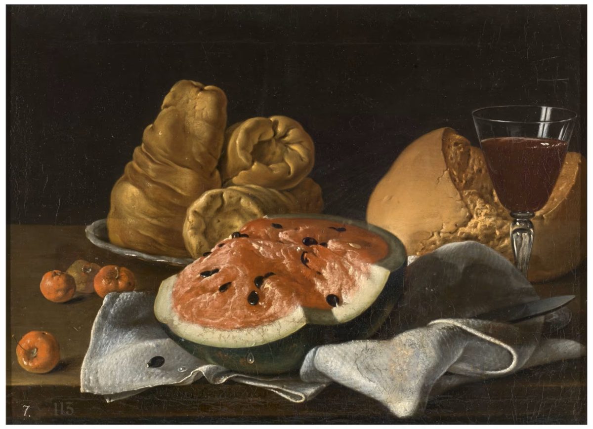 Sličan efekat postiže i djelo Luisa Egidia Meléndeza iz 1779. godine: „Mrtva priroda s lubenicom, acerola trešnjama, sirom, hljebom i vinom“. U poređenju s tim suhim i konzervativnim namirnicama, lubenica dominira platnom, s kapima koje kao da će svakog trenutka procuriti iz slike.
