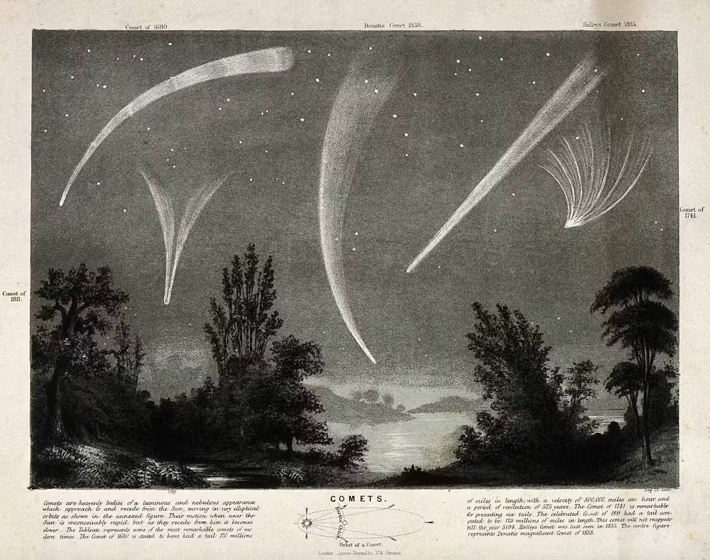 Nijedna spektakularna kometa nije se pojavila na nebu 1869. godine, ali ta godina ipak ostaje zapažena u književnosti zahvaljujući priči Kometa. Andersenova reflektivna priča o kosmosu i duši počinje jednostavno. Dječak puše balone dok, uz svjetlost svijeće, njegova majka traži znakove o očekivanom životnom vijeku djeteta. Dječja radost i praznovjerje žive jedno pored drugog u njihovom domu.