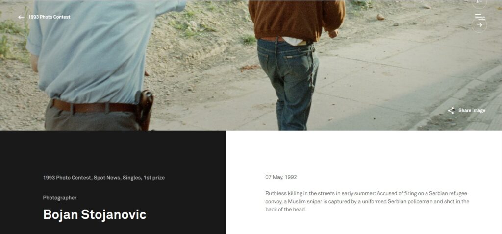 Godinama je potpis uz tu fotografiju na web stranici WPP-a glasio: „Nemilosrdno ubijanje na ulicama početkom ljeta. Optužen za pucanje na konvoj srpskih izbjeglica, uniformisani srpski policajac zarobljava muslimanskog snajperistu i puca mu u potiljak.“ Nakon što sam WPP-u poslala snimak dokumentarca, promijenili su potpis na svojoj web stranici, mada nekih 30 godina nakon što je to već bilo spomenuto na holandskoj javnoj televiziji tokom pripreme izložbe.