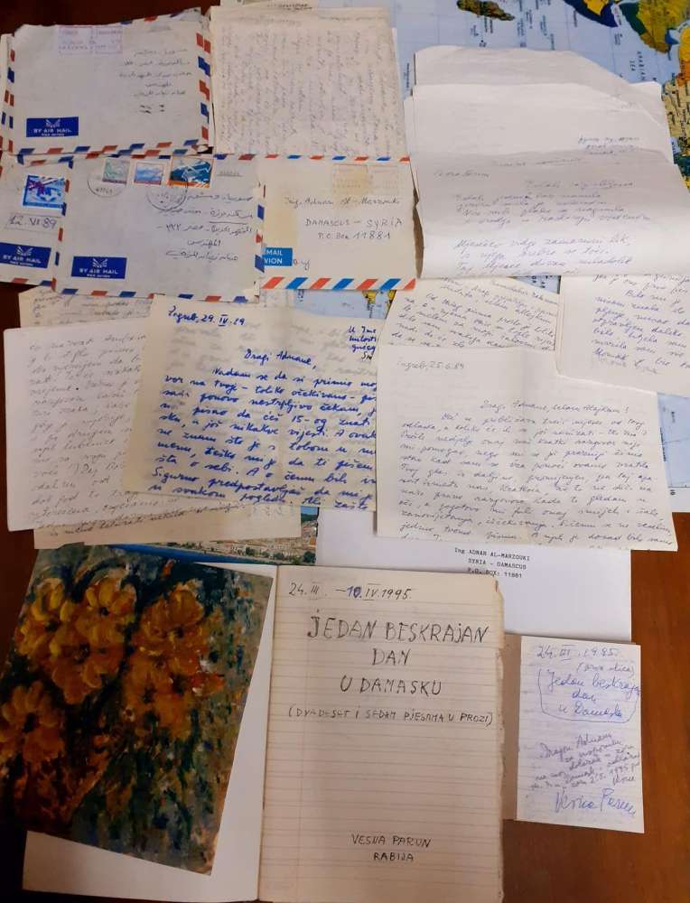 Nasuprot državnog arhiva, gdje u miru počiva ostavština Vesne Parun, Adnanov privatni arhiv djeluje kao njegova suprotnost, kao topla, rasuta, gotovo filmska “scena” na stolu. Zgužvani papiri, preklopljene stranice, kuverte s arapskim adresama, markice, pečati, avionom poslane riječi. I tu se, odjednom, ono što je javnost često pretvarala u mit vraća u svoju elementarnu materijalnost. Naime, postoji niz Vesninih pisama koja su u Adnanovom posjedu, u Damasku/Kairu, i koja, barem od 1989. godine, pokazuju da se odnos prijateljski nastavlja nakon njegova odlaska iz Zagreba. Pisma su naslovljena sa „Dragi Adnane…“, „Selam alejkum“. A motiv njegovih očiju, koji je u njenoj pjesmi uzdignut do metafizičkog svjetionika, u korespondenciji postaje gotovo doslovan jer 1989. ona piše da joj nedostaju njegove oči, dakle, stih se vraća svom izvoru.