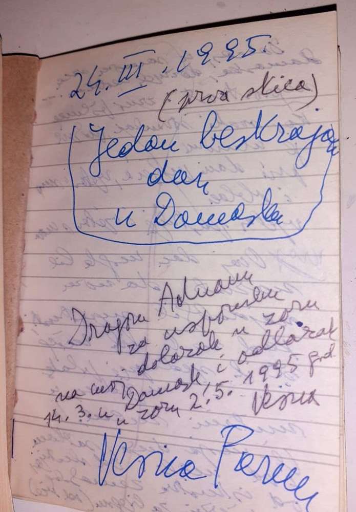 U tom razdoblju, prema Adnanovu svjedočenju, nastaje i neobjavljena zbirka pjesama u prozi „Jedan beskrajan dan u Damasku“, rukopis od 27 tekstova koji je posvetila i darovala njemu, i koji je i danas u njegovu vlasništvu. Riječ je o skrivenoj građi koja bi mogla proširiti naše razumijevanje Parunine kasne poetike i njezina odnosa prema prostoru Orijenta. Adnan kaže da i dalje piše te da je dobio nekoliko književnih nagrada, što ukupnoj priči daje posebnu draž.