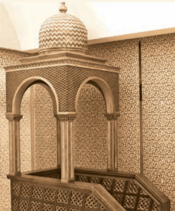 Zidovi i stupovi između središnjeg dijela i prostranih bočnih dijelova bili su obloženi zelenim talijanskim mramorom. Svi zidovi dvorane, uključujući i mimber, bili su ornamentirani sadrenim plastičnim ukrasima koje je izvela grupa hrvatskih umjetnika pod vodstvom akademskog kipara Joze Turkalja. Cijela ornamentika bila je utemeljena na starohrvatskim motivima pletera u koju je vješto ugrađena orijentalna ornamentika s kaligrafskim plastikama arapskim slovima ispisanih ajeta iz Kur’ana. Ove je ispise sastavio i ispisao Muhamed Mujagić, umirovljeni šerijatski sudac iz Sarajeva, dok je mihrab kazeinskim bojama oslikao akademski slikar Julije Merlić iz Varaždina.