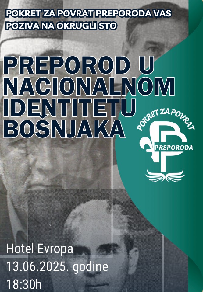 Okrugli sto i osnivačka skupština Pokreta za povrat Preporoda održavaju se 13. juna 2025. u 18:30 u hotelu Evropa u Sarajevu. Organizatori pozivaju sve Bošnjake, ali i sve građane BiH koji cijene historijsku pravdu i kulturni kontinuitet, da se pridruže borbi za povratak duha Preporoda.
