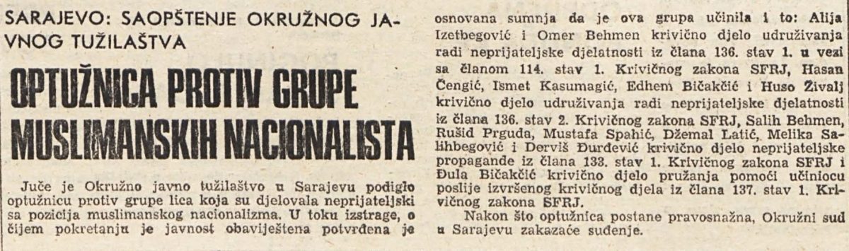 Na današnji dan, 23. juna 1983. godine Večernje novine objavile su vijest da je Okružno javno tužilaštvo u Sarajevu podiglo optužnicu protiv grupe lica zbog navodnog djelovanja s pozicija “muslimanskog nacionalizma”, što je u tadašnjoj Jugoslaviji tretirano kao ozbiljno krivično djelo.