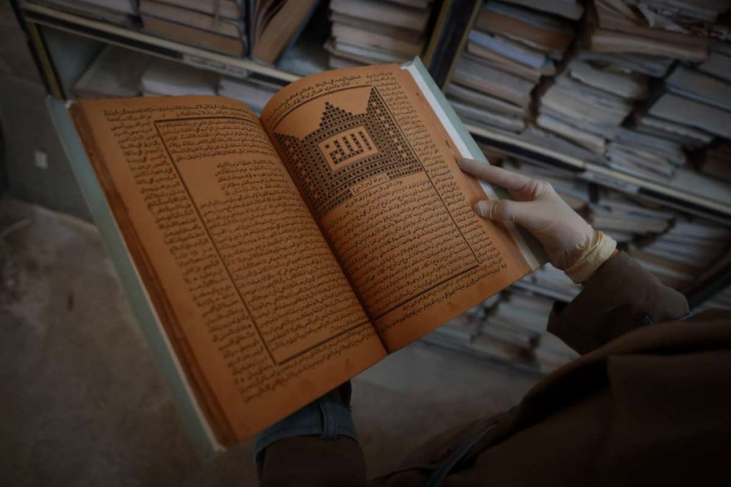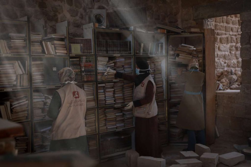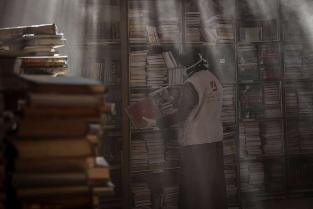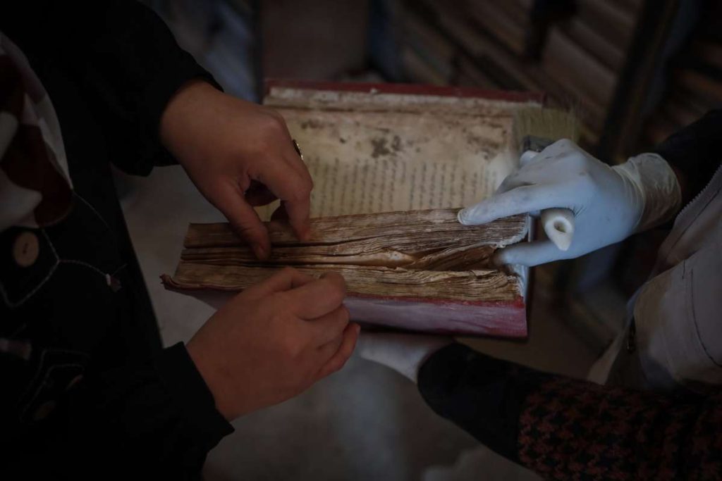 Unutar jedne od starih kamenih prostorija biblioteke, jedna žena je kistom brisala prašinu sa starog sveska, dok su drugi volonteri s maskama za lice i rukavicama čučali na podu listajući hrpe knjiga.