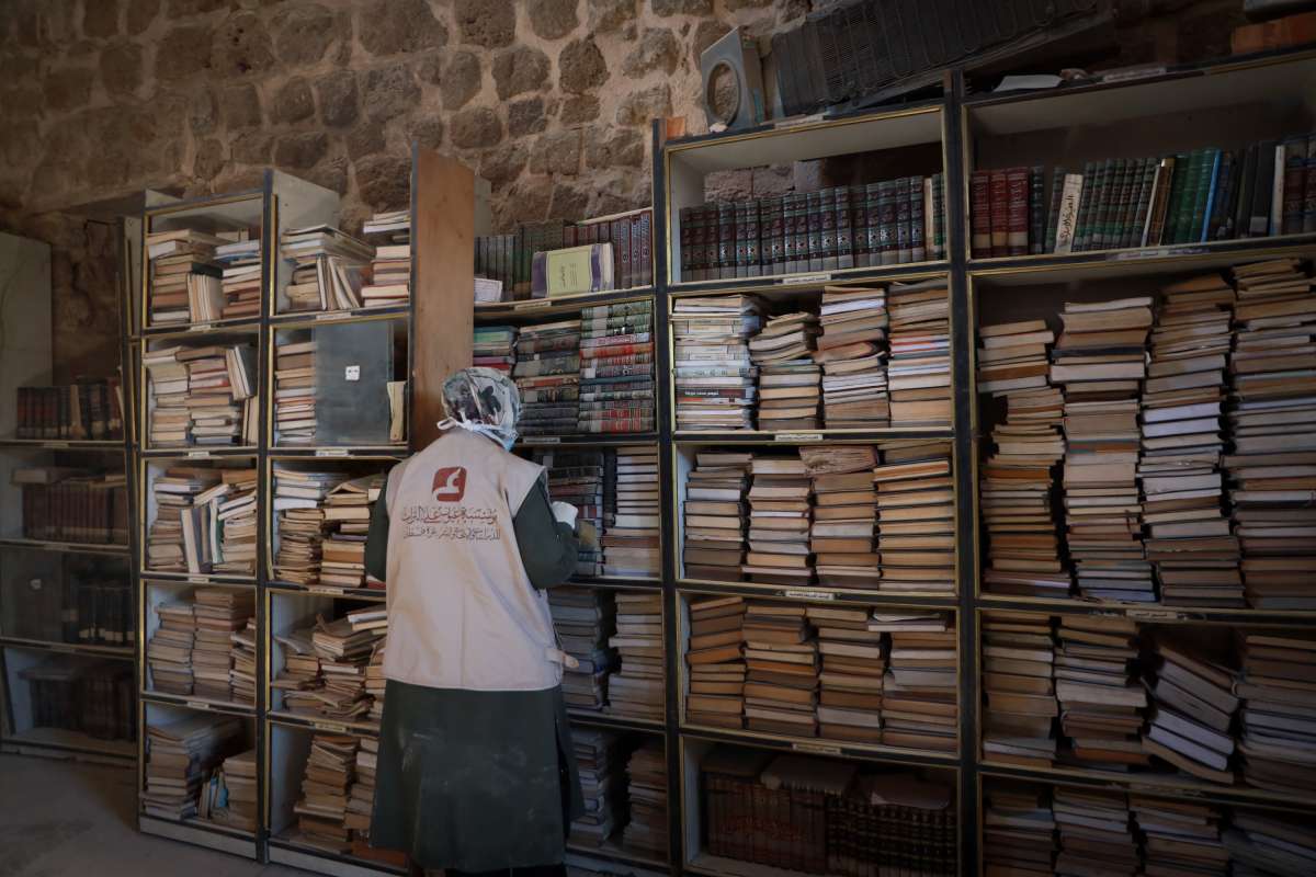 Unutar jedne od starih kamenih prostorija biblioteke, jedna žena je kistom brisala prašinu sa starog sveska, dok su drugi volonteri s maskama za lice i rukavicama čučali na podu listajući hrpe knjiga.