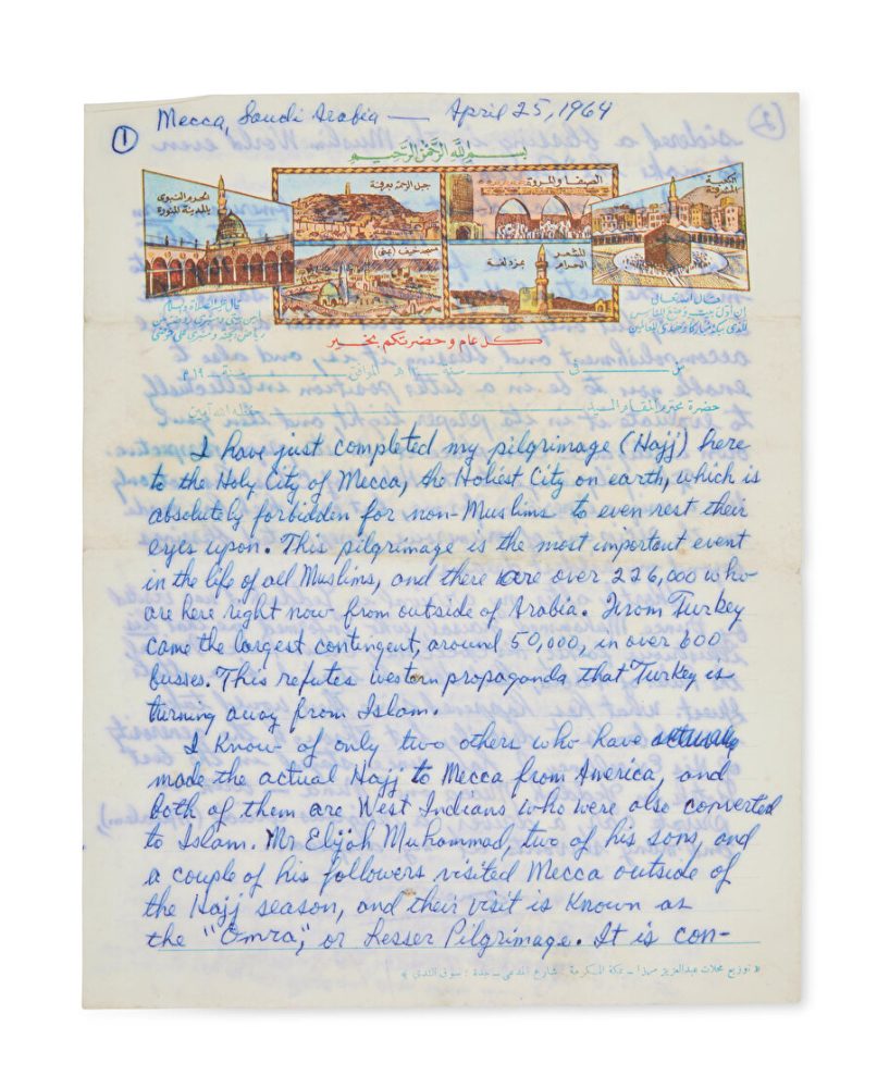 Malcolm Little, poznatiji kao Malcolm X, karizmatični afroamerički borac za ljudska prava i muslimanski vjerski vođa, 1964. godine otputovao je u Saudijsku Arabiju kako bi obavio hadž – veliku muslimansku hodočasničku dužnost. Ovo putovanje, duhovno i ideološki, predstavljalo je prekretnicu u njegovom životu. Iz Meke je slao rukom pisana pisma i razglednice u Sjedinjene Američke Države, svjedočeći o dubokom utjecaju koji je hadž imao na njegovo shvaćanje vjere, identiteta i rase.