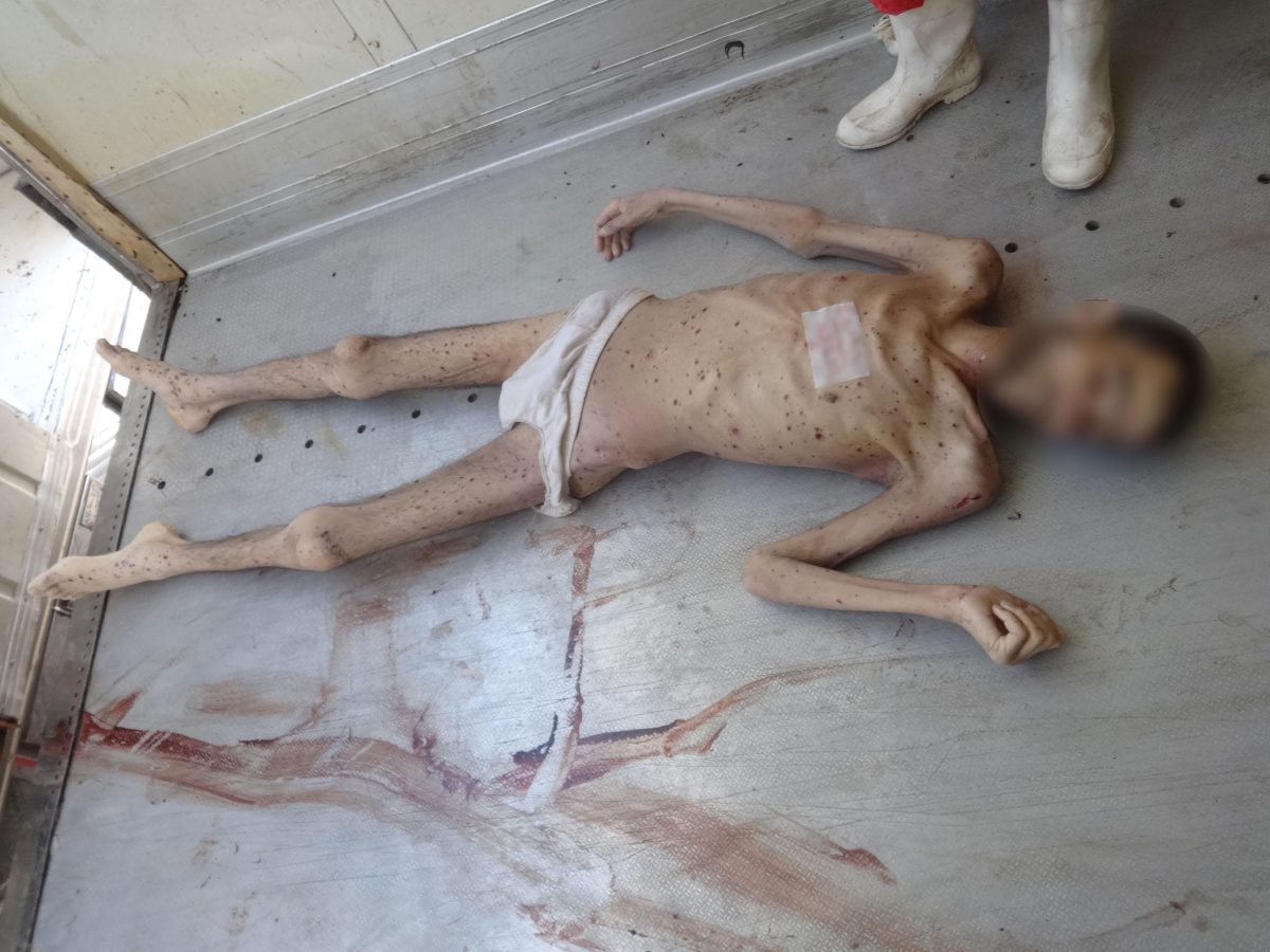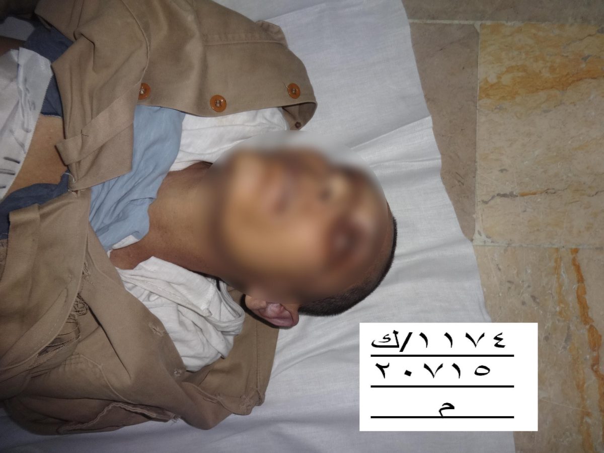 Drugi muškarac, broj 4038, leži nag u zadnjem dijelu kombija, naborane kože, isprskan krvlju i prekriven muhama. Poznati opozicijski aktivista Mazen al-Hamada, broj 1174, leži u zatvorskoj uniformi na mramornom podu, sa zapešćima obilježenim tragovima vezivanja. Njegova bosa stopala su modra, što svjedoči o premlaćivanju. Broj 2389 je novorođenče.