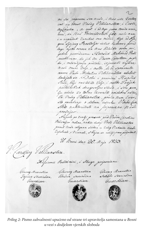 Pismo zahvalnosti gvardijana, s druge strane, podsjeća nas na to da se tolerancija ne podrazumijeva, već da se ona aktivno gradi kroz dijalog, pravo i međusobno uvažavanje. Spajajući 1463. i 1853. godinu, bosanski franjevci su trasirali put koji je omogućio da katolička kulturna i vjerska baština preživi sumrak jednog carstva i uđe u moderno doba s očuvanim identitetom. Taj period ostaje trajna lekcija o tome kako se, čak i u najtežim političkim okolnostima, kroz mudru diplomatiju i insistiranje na slovu zakona, mogu srušiti barijere koje su stoljećima izgledale nepremostive.