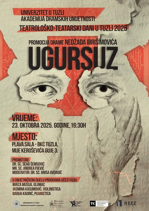 Na Velikoj sceni Bosanskog kulturnog centra Tuzla večeras će, s početkom u 20:00 sati, bit će održana premijera predstave Ugursuz Nedžada Ibrišimovića, u režiji Ise Porovića. Predstava je centralni događaj manifestacije Teatrološko-teatarski dani u Tuzli 2025, koja se održava od 23. do 25. oktobra.