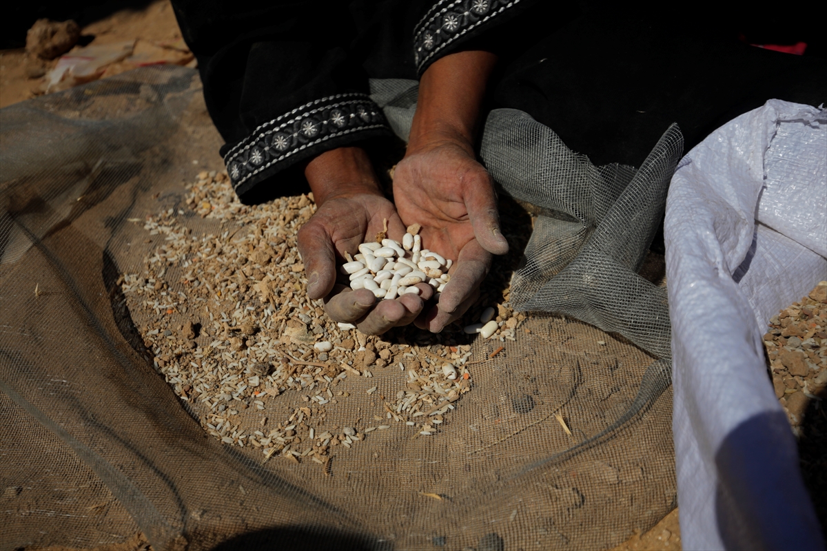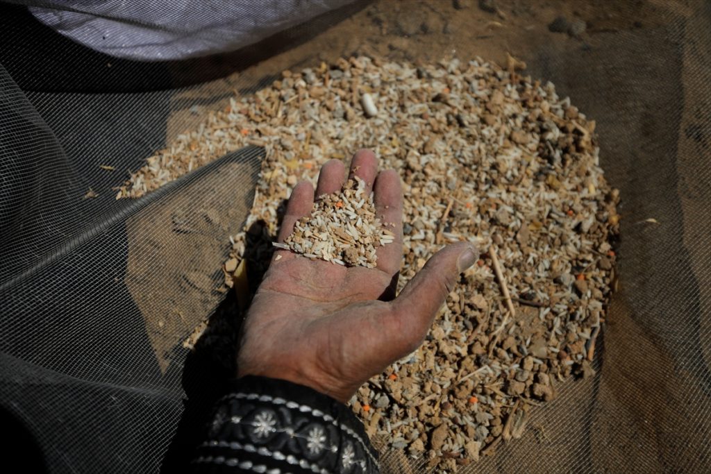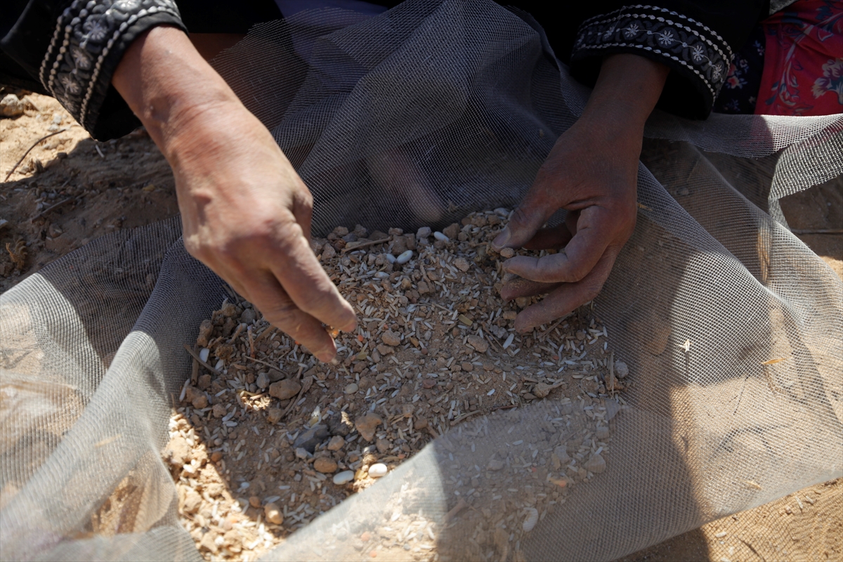 Koristeći sito, Saad i Umm Ahmed odvajaju razasute mahunarke od zemlje u nastojanju da sačuvaju nešto od njih za upotrebu.
