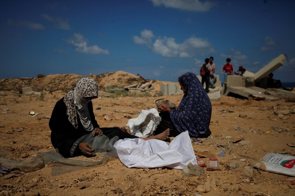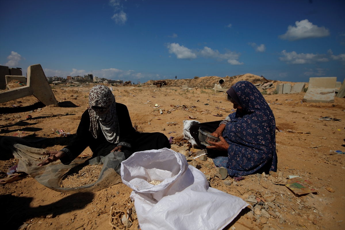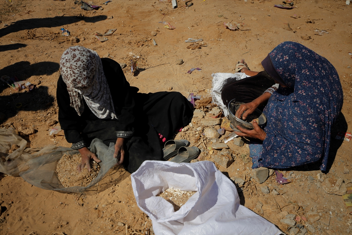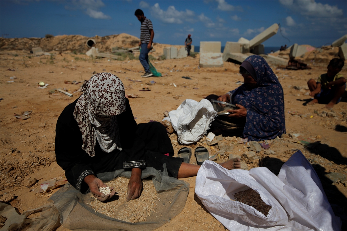 Palestinke Umm Saad i Umm Ahmed pokušavaju izvući rižu, leću i grah iz pijeska, iz paketa pomoći koji su bačeni iz zraka i raspršeni pri udaru u gradu Gazi. Koristeći sito, Saad i Umm Ahmed odvajaju razasute mahunarke od zemlje u nastojanju da sačuvaju nešto od njih za upotrebu.
