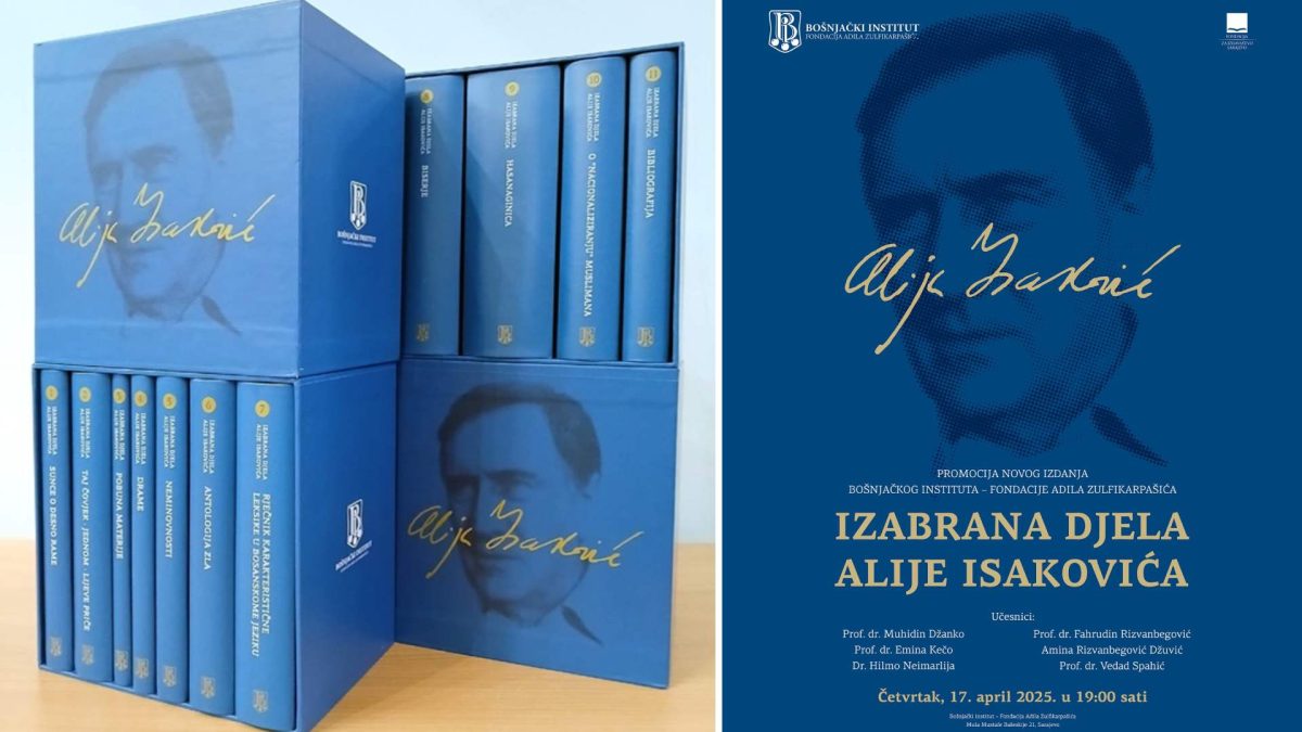 Promocija “Izabranih djela Alije Isakovića” održat će se u prostorijama Bošnjačkog insituta u Sarajevu večeras u 19 sati. Ovo je do sada najveći izdavači projekat koji je pokrneuo Bošnjački institut – Fondacija Adila Zulfikarpašića, a obuhvata 11 knjiga književnika Alije Isakovića. Po opsegu, riječ je o jednom od najvećih izdavačkih poduhvata u poslijeratnoj Bosni i Hercegovini.