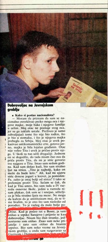 U tadašnjem intervjuu za jedan beogradski magazin Vučić je između ostaloga izjavio: „Kada je počeo rat u Bosni, ja sam otišao u srpsko Sarajevo i prijavio se kao dobrovoljac. Nisam bio član stranke, jednostavno sam otišao. Znao sam neke prijatelje i zato sam otišao da branim srpstvo. Bio sam neko vreme na Jevrejskom groblju”.